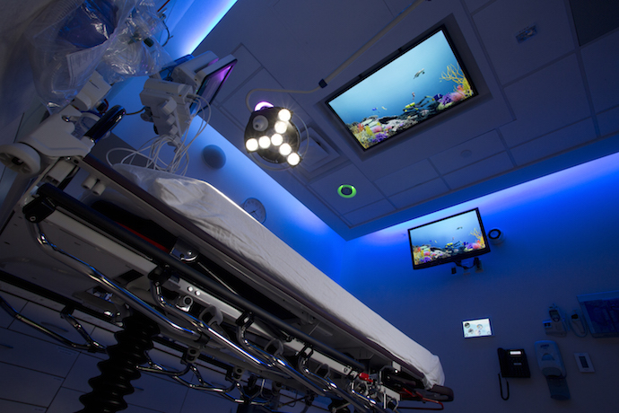 The experience is all controlled through touch panels with controls to play, pause, and stop the video. For the spaceship video. a caregiver just touches the spaceship icon on the tablet, and celestial hues of purples and blues illuminate the walls as the screens on the ceiling display a futuristic space shuttle. There is a low rumble from the spaceship’s engine and a muffled voice over the intercom initiates the countdown. Instead of the stark, sterile hospital room, an exploration of space begins and the journey continues with flashes of bright colors as the spaceship revs past asteroids, neighboring planets, and nearby galaxies.