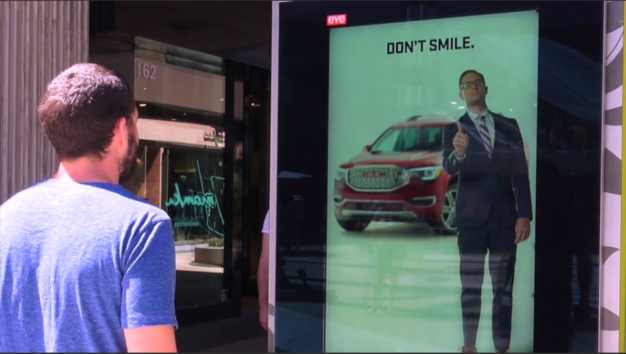 A campaign for a GM vehicle used face pattern detection technology to pick up the gender, facial expression, age and composition of the passing audience and then serve branded content targeted to that specific audience.