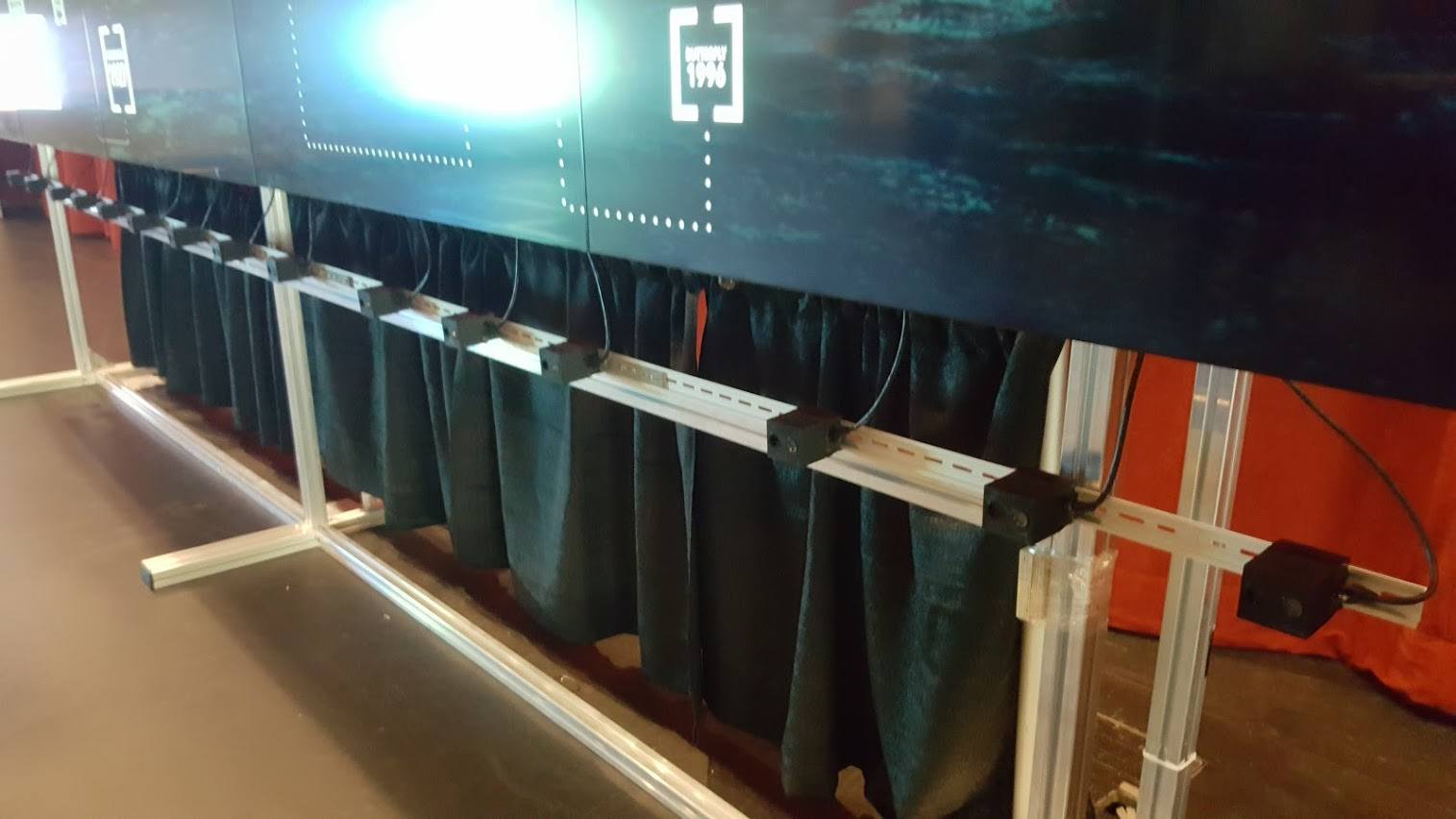 You can see the sensors in their enclosures, all connected by ethernet cables.The set-up was a wide 2 by 5 set of LG narrow bezel LCDs, with a bank of little laser sensors sitting in 3D-printed cases. If people were just walking by or seeing the display wall from a distance, it was running a set of rotating media files on the full display canvas, about the Niagara Parks Commission, which has several attractions golf courses.