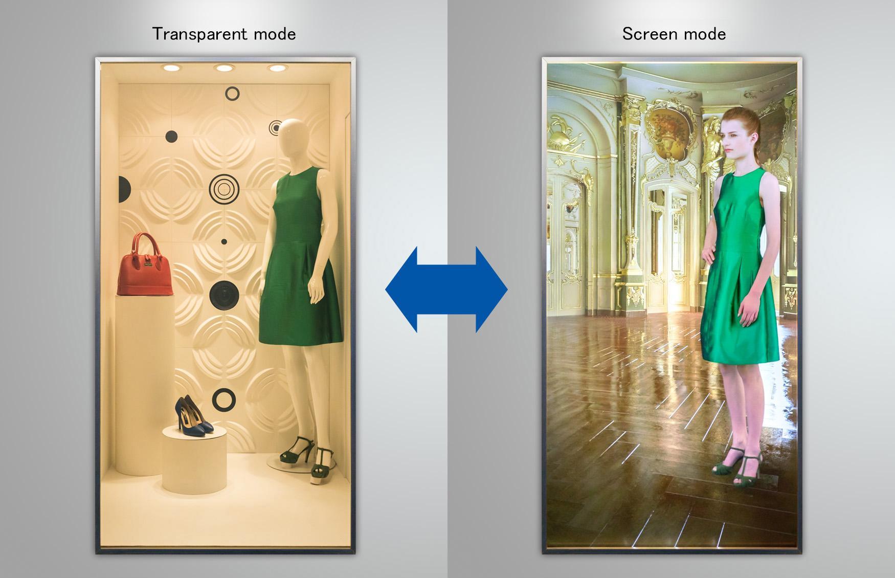 During the transparent mode, it will serve as a shop window showcasing products and exhibits, and during the screen mode it can reproduce high resolution images on the glass to introduce information about new products or about various campaigns during the sale season, helping transform the show window into an even more captivating environment. Moreover, multiple screens may be combined to create one large screen.