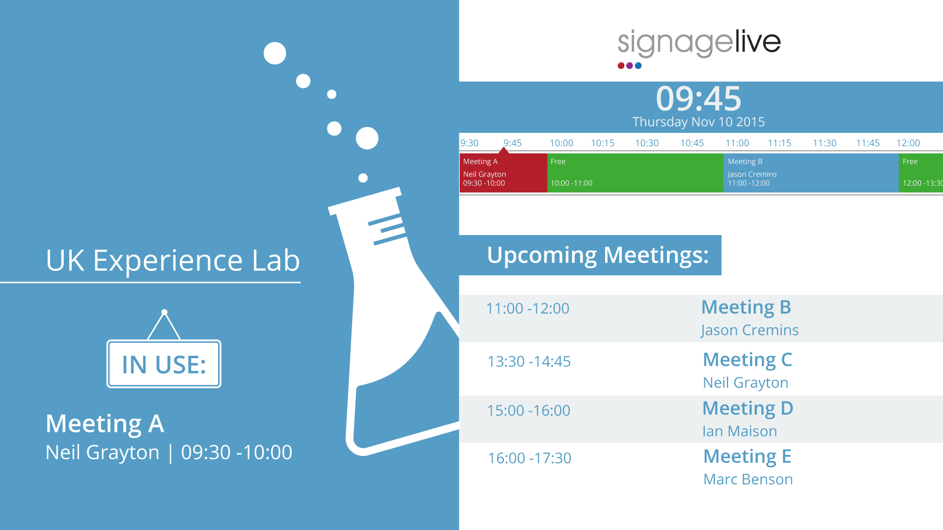UK-based Signagelive has joined the increasingly lengthy list of companies offer pure-play meeting room sign systems or, in this case and many others, applications that do the job, running off a digital signage CMS.