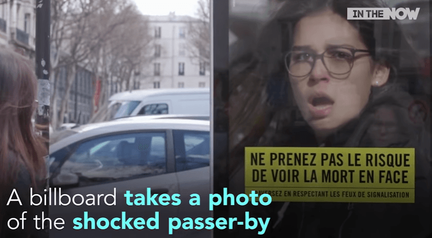 In Paris, sensors at a busy crosswalk monitor pedestrian foot traffic and the red, amber or green state of the crossing lights. If a person crosses the street on a red light, the digital media player driving the digital OOH poster at that locations is triggered to play the sound of screeching car brakes, and capture the reaction of that shocked/scared pedestrian. That person’s face is almost immediately up on the actual poster, with a message overlaid on it, reading: “Don’t take the risk of facing death.”