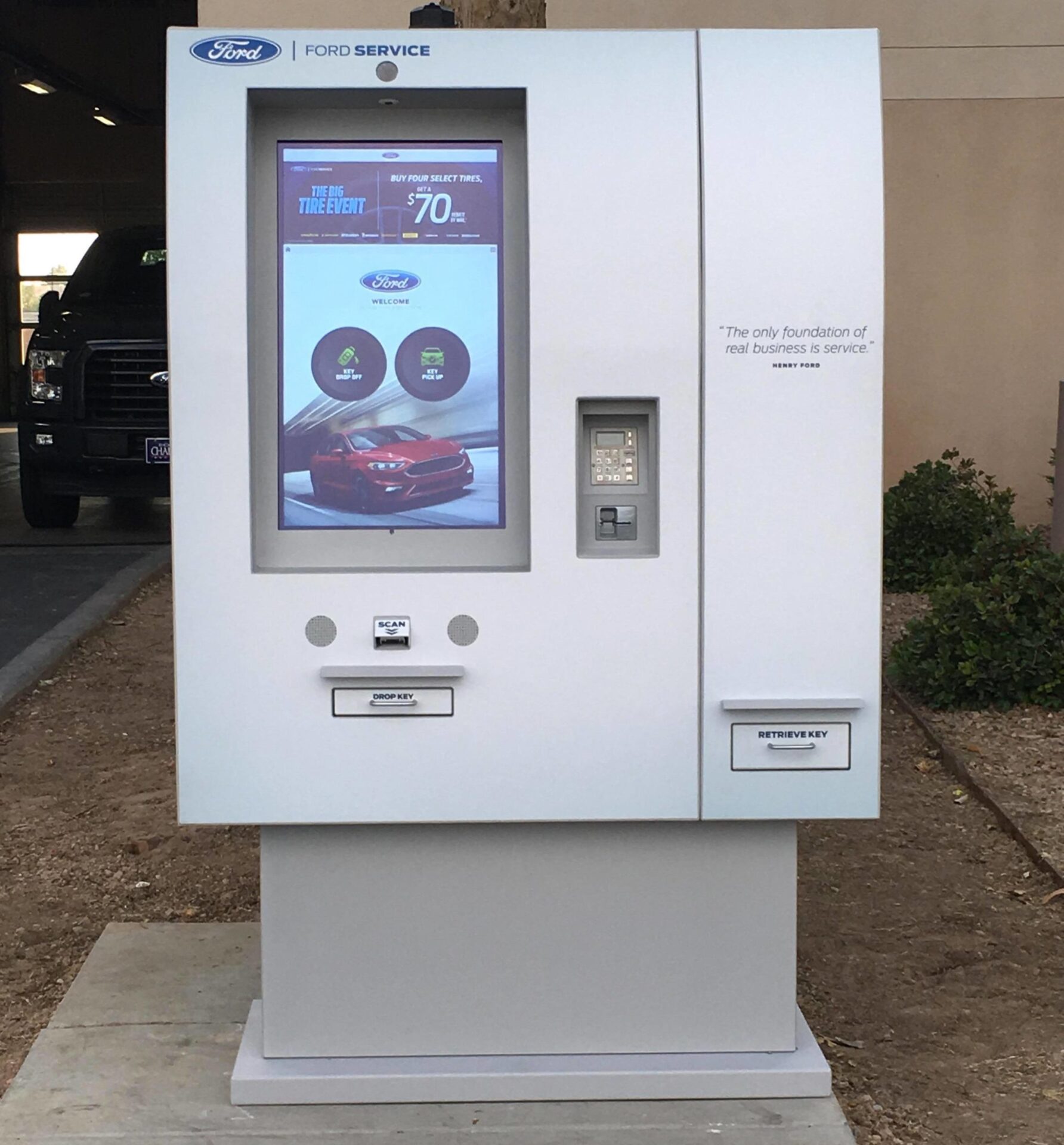 It is part of a test that started in March at a Michigan dealership, “an industry-first Smart Service Kiosk aimed at increasing customer convenience related to vehicle service,” says a Ford press release. “The kiosk allows customers to come to the dealership at any time to drop off and pick up their vehicle key or obtain keys to a loaner vehicle, select needed services from a quick-pick menu, and pay for service using a credit or debit card.”