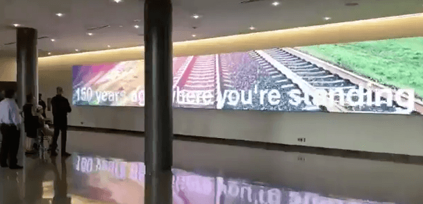 There’s also a 7-foot tall by 60 wide fine pitch LED wall in the building, put together by solutions provider Coffman Media and running Signagelive’s CMS. It’s part of a $140 million upgrade to the facility, that also involved digital meeting room signage.
