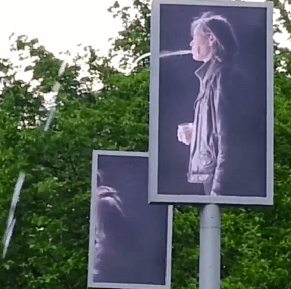 This is a public art installation somewhere in Switzerland. A water spout is sync’d with the content so it looks like the subject on the screen spitting out water is flying off the screen.
