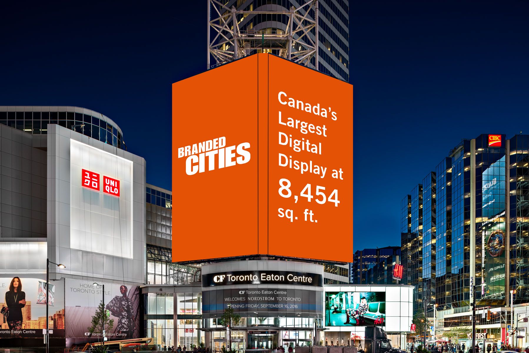 The conjoined tower is about 45% larger than the second largest, the 5,820 square feet digital display on the Atrium on Bay (AOB) Media Tower, which is also run by Branded Cities. The Eaton Centre tower is there in a deal with property owner Cadillac Fairview.