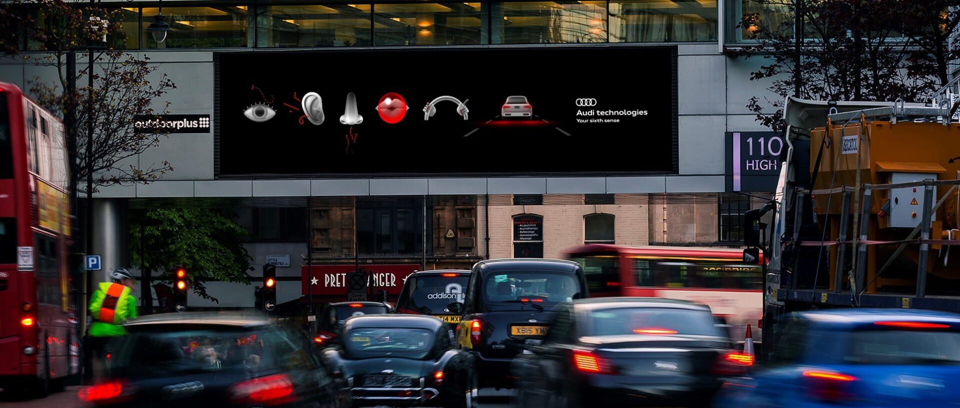 Created by BBH and produced by Grand Visual, the UK campaign for Audi that’s now active uses traffic, time and weather data to trigger content that is contextually relevant at each digital OOH display location. For example, when the traffic is heavy, the creative showcases Audi’s Pre-Sense – a built-in technology package for predictive safety. In bad weather, the boards run messaging for all-wheel drive. And so on.