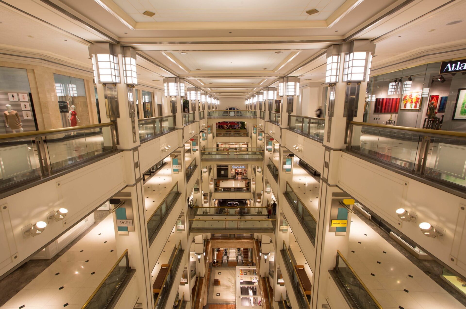 The centerpiece of a makeover at 900 North Michigan Shops is a massive, 190-foot-long digital art installation spanning the ceiling of the nearly 30-year-old complex. Visible from all floors, and built in 10 sections, the digital installation mimics a giant skylight that connects the complex’s interior to the exterior sky.