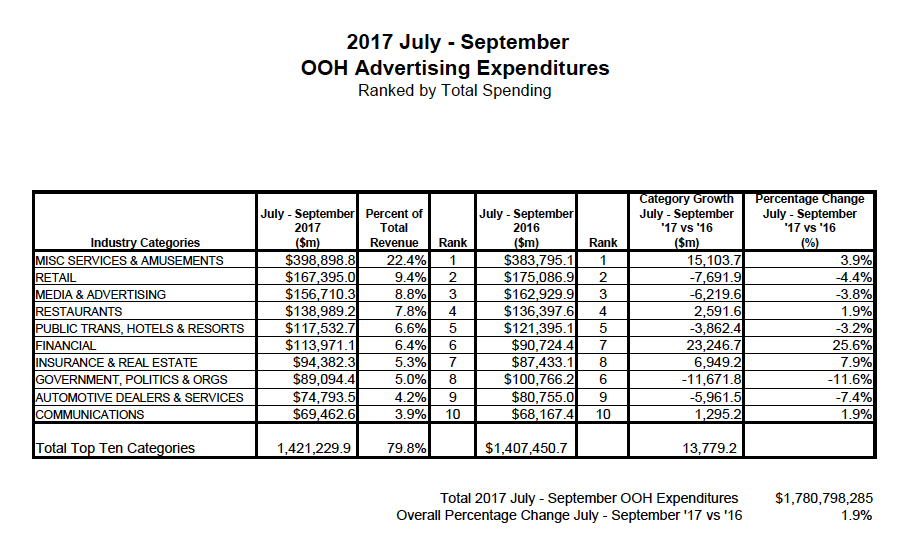 Out of home advertising revenue was up 1.9 percent in the third quarter of 2017, compared to the stretch in 2016, accounting for $1.78 billion in ad spend, says the Outdoor Advertising Association of America (OAAA).