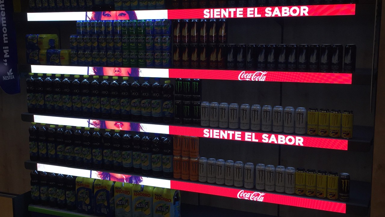 I like the concept and think shelf-edge display can have an impact with consumer behavior, but the low resolution of the LED strips is a little problematic when the content starts getting into text and numbers. I think the block-y text I see here and saw way back at NRF is done to work with the pixels, given a lot of fonts have gentle curves that would not work here.