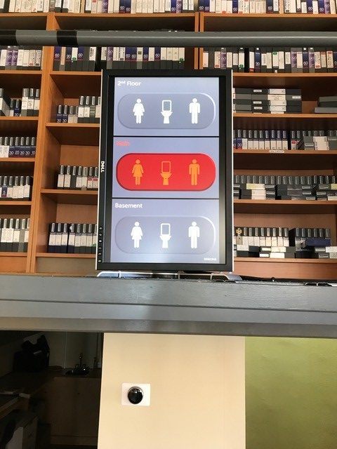 “We have lots of digital signage at our old bank building in Montreal,” says James Fine, the President of Telecine, “but by far the most useful, albeit unimaginative, is this one. We have a bathroom on each of our three floors. This sign allows staff to know when and where to go. Red means someone is in that one.”