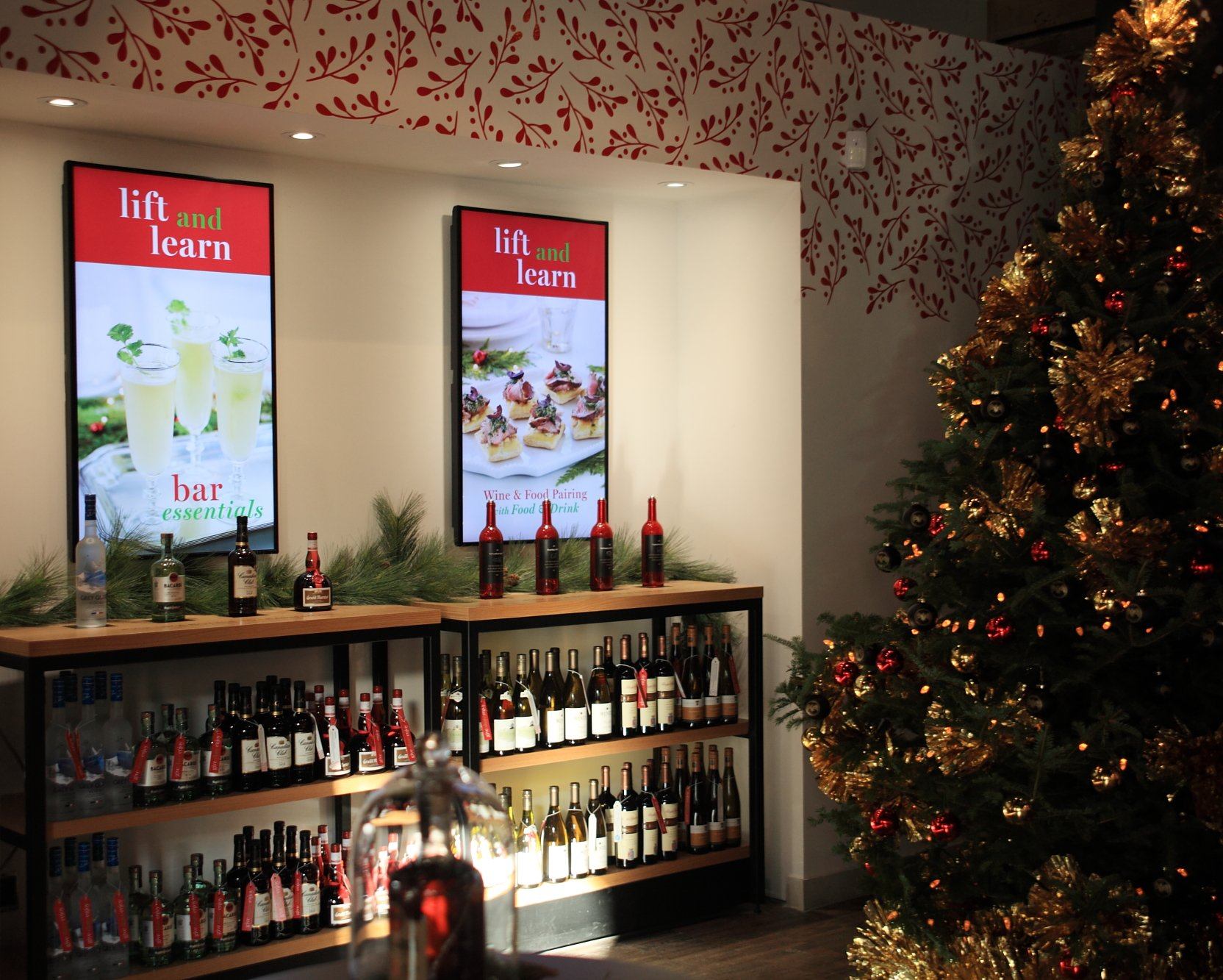 To encourage browsing and shopping the endless aisle of Ontario VQA wine products, there are several tablets stationed around the space. There’s also a screen running curated social media content.