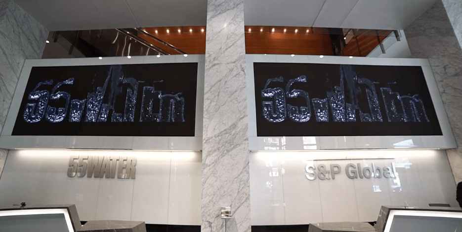 This is a nice pair of 20 by 8 foot fine pitch LED screens that have been lit up in the lobby of 55 Water Street, in the Wall Street district of Lower Manhattan.