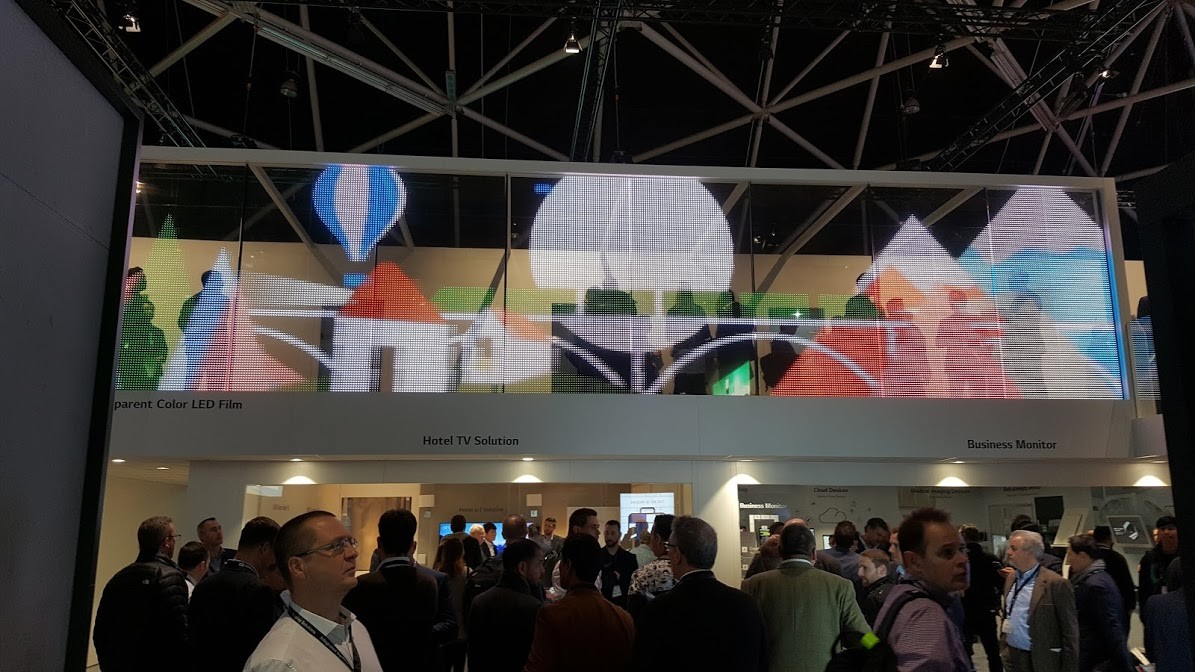 Had a better look around some of the big booths. Transparent OLED is back at LG, and featured. The company also has low rez LEDs embedded in glass, like last year, but now it is color. Limited uses cases for it but I like nonetheless.