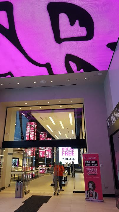 This is the T-Mobile store, which has a NanoLumens LED wall that runs up one side of the entrance, and then along the ceiling. There’s more big digital at the rear.