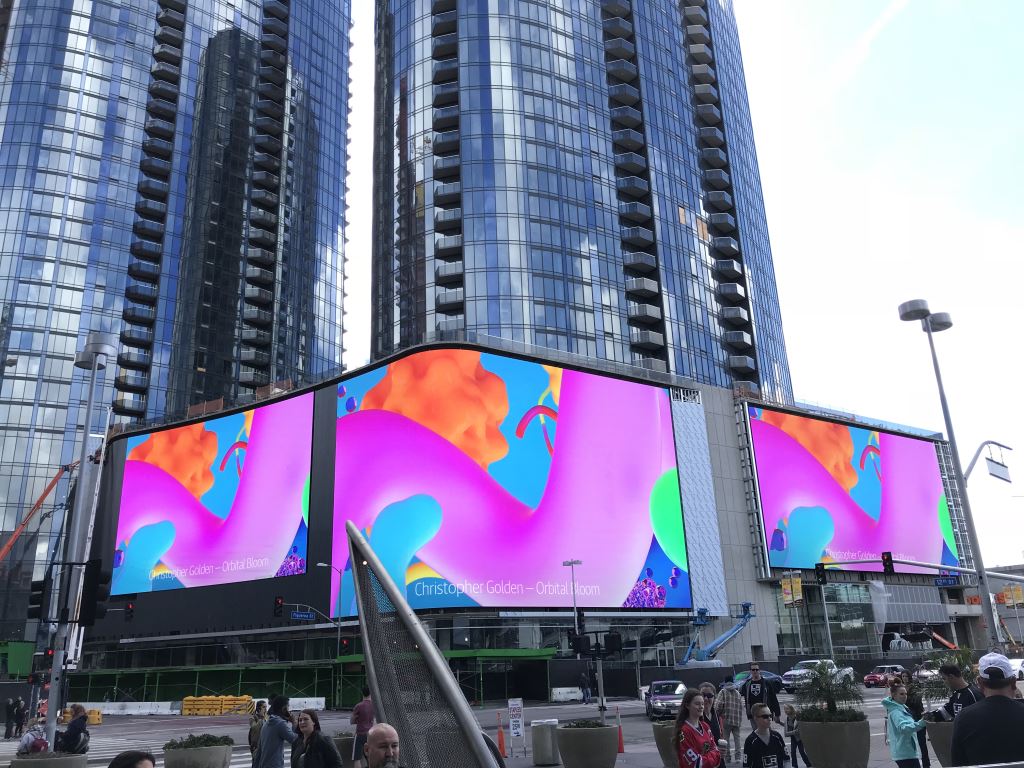 Jason Helton, who runs ops for the LED display company Sansi was in town from Austin, TX to oversee the lighting up of a new three panel, 10mm display across from the Staples Center that wraps around a street corner. It is 38,000 sq. feet of LED chips. It looks gorgeous, though the stuff Jason sent me from daytime testing looks better than the booked Nike campaign running on them.