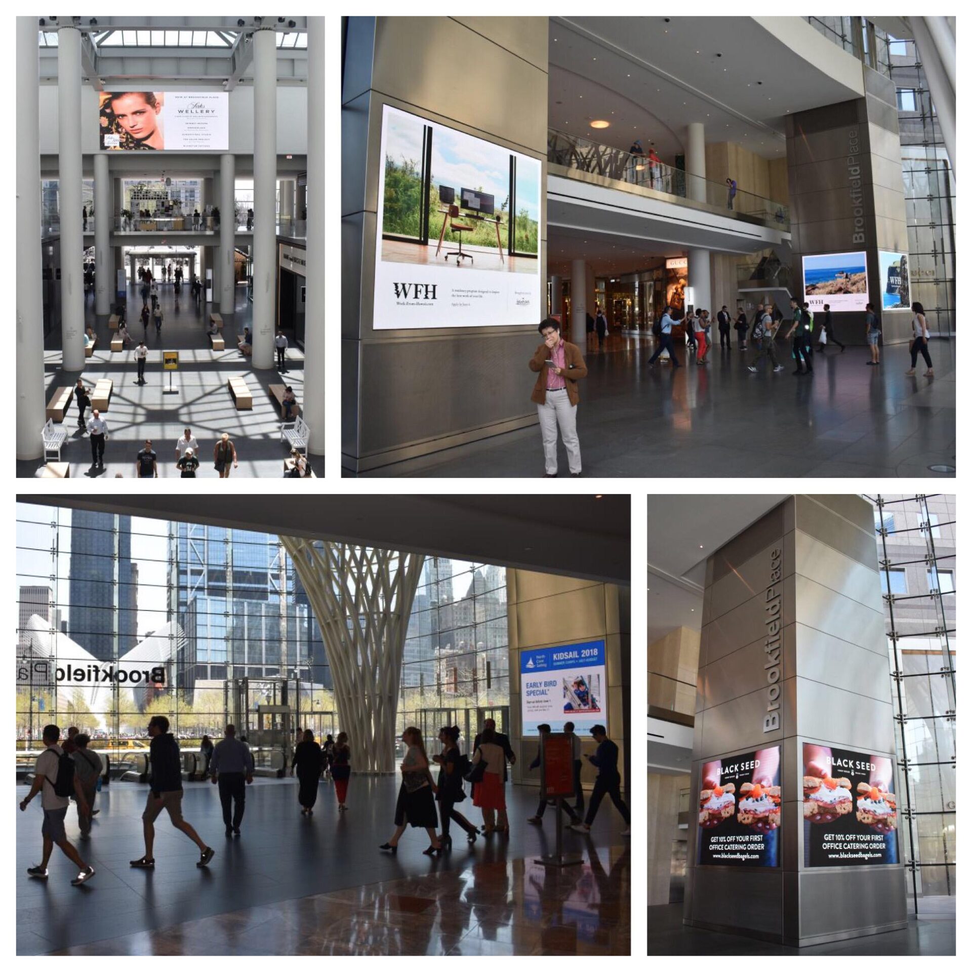 This is a series of new digital OOH displays in a office tower mall in the area around the rejuvenated World Trade Center complex in New York.