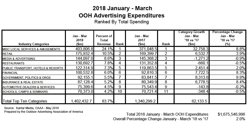 The Outdoor Advertising Association of America (OAAA) says advertising revenue rose two percent in Q1 2018 compared to the previous year, accounting for $1.68 billion in ad spend.