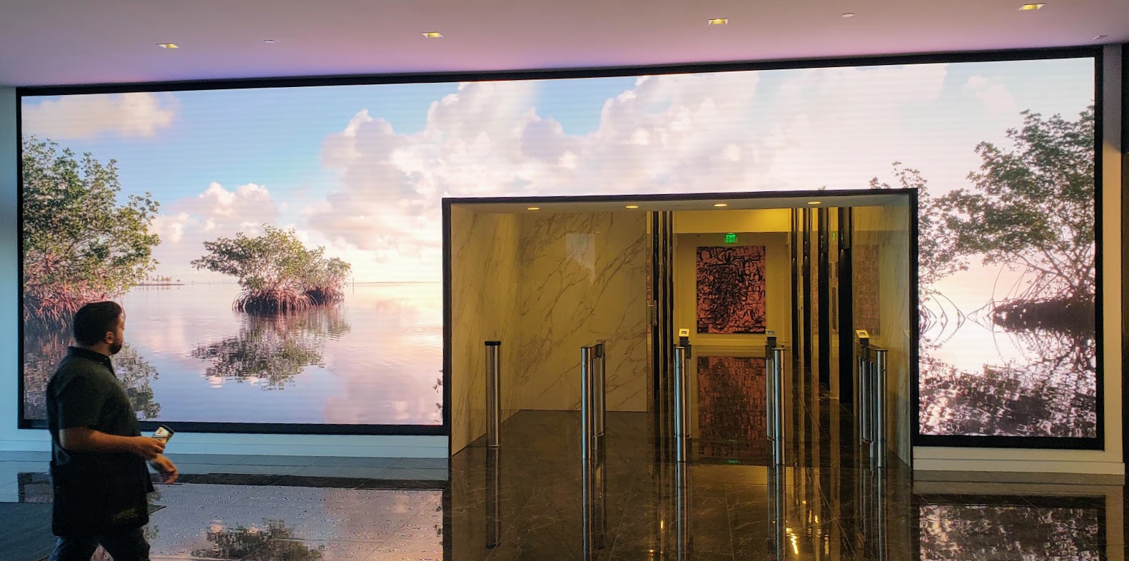 The wall just went in, and the current material is high-rez Miami scenic footage. The plan, however, is for local artists to generate motion digital pieces that play with the big canvas, and likely that entryway.
