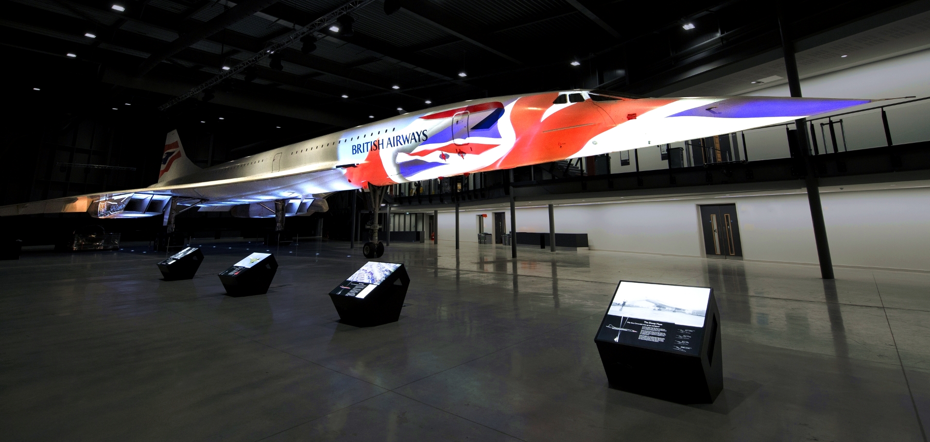 A specially constructed hangar at Aerospace Bristol in England is home to the last Concorde supersonic passenger jet ever built, and the long, lean jet itself is used as the projection surface for a 12-minute media piece about the Concorde program.
