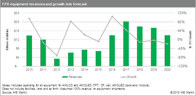 “The FPD equipment market has always been highly volatile depending on market and technology changes. Some slow-down is not surprising following years of record high equipment spending,” Li said. “How all the equipment being installed will affect the future opportunity is a question that equipment makers are now struggling to answer. Based on IHS Markit analysis, the correction will continue beyond 2020. Even so, hope for expanding the new technology investments in AMOLED and quantum-dot (QD) OLED TVs as well as foldable displays, combined with industry restructuring and increased demand as prices fall offers the hope of another positive cycle coming.”