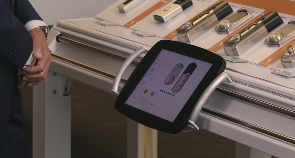 Stumbled via Linkedin on this video post about a retail merchandising solution that puts a tablet on a slider rail in front of a bank of related products.