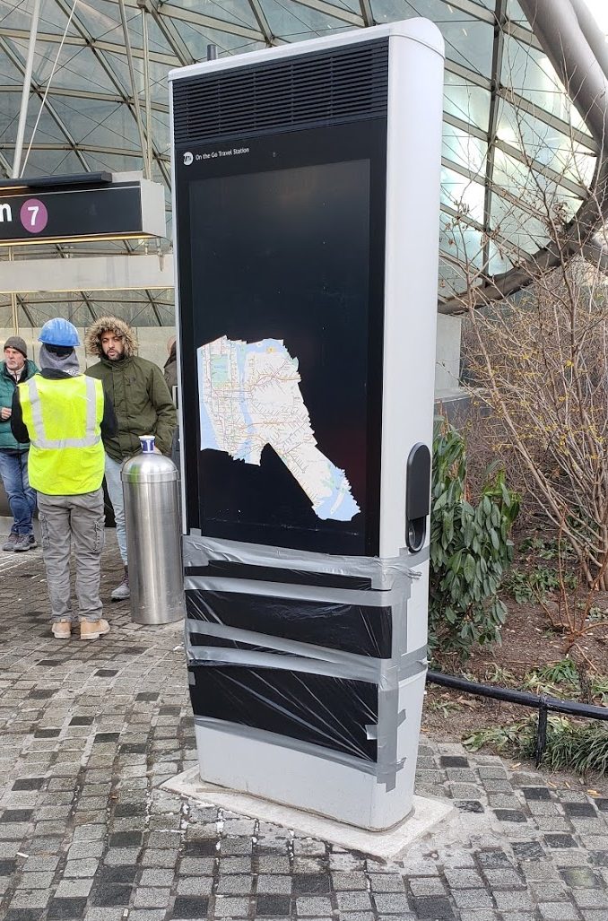 So it is eye-opening to see a screen at the entrance to the subway station at the many-billion dollar Hudson Yards development – near the Javits Center – that went a few rounds with someone and lost. Bottom has been kicked in, I guess, and then duct-taped. And someone, possibly a city employee thinking he or she was being helpful, pasted on a city map – since partially torn off.