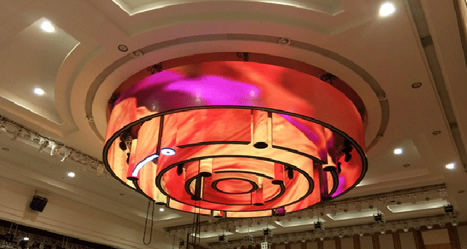 It is an LED chandelier thingie (technical term) made up of five 4mm pixel pitch flexible LEDs, There are also 12 suspended LED columns. The thing can travel up and down more than 30 feet.