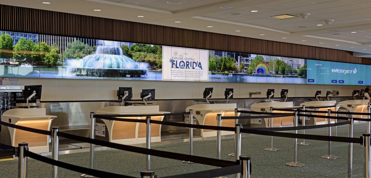 The Greater Orlando Aviation Authority (GOAA) had a total of 700 LG 55-inch ultra-thin-bezel videowall screens installed to create a continuous 1,561-foot digital display wall behind airline counters. There are another 500 LG displays used for way-finding, from the check-in areas to concessions to security checkpoints.