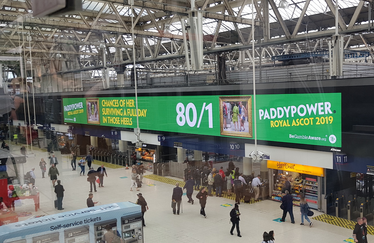 A media campaign for the betting service Paddy Power used DOOH screens in and around Waterloo and Clapham Junction rail stations in London to target crowds going to the big annual Royal Ascot race meeting, which is similar to the Kentucky Derby when it comes to getting dressed up for the day. The race course is west of London, kind of past and a bit south of Heathrow.
