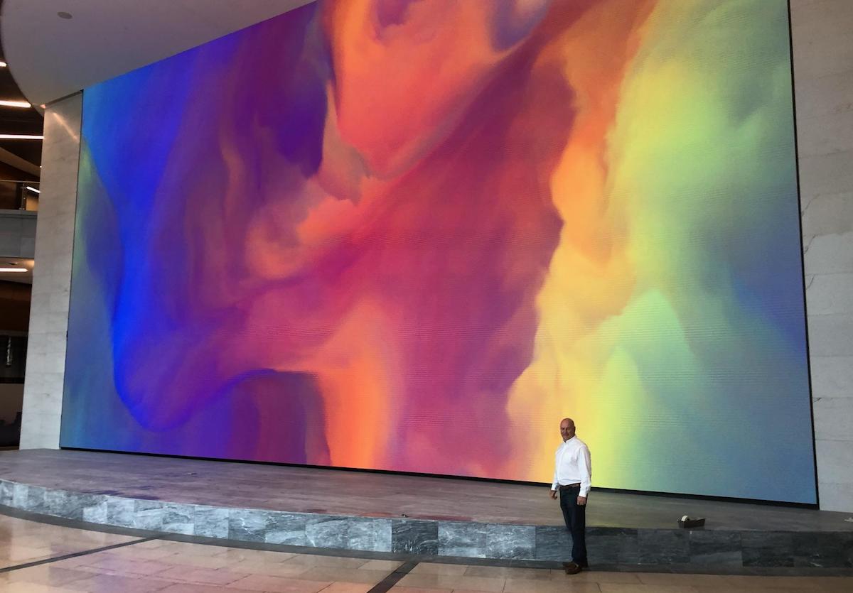 This is a newly installed and fired-up direct view LED video wall in the lobby of a new office tower in the financial services-dominant downtown of Charlotte, NC, spotted on Linkedin.