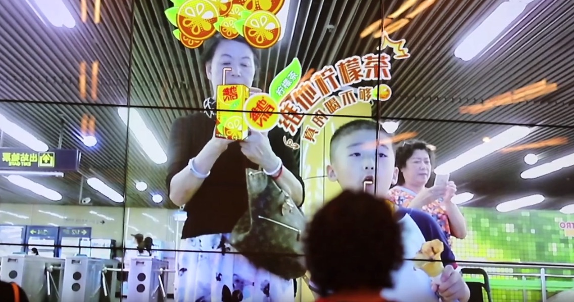 This is a 10-metre (30-ish feet) wide interactive LCD video wall in a Shanghai subway station that is using augmented reality to get passengers excited about a lemon iced tea product.