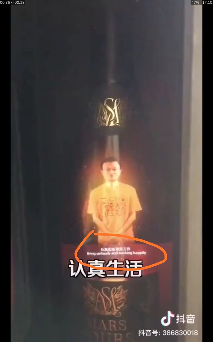 A pull-out slot to the side of the wine bottle had a scannable bar code that launched a video that then plays on the recipient’s smartphone, with Jack Ma relating 20 years of Alibaba. Popping the slot back into the packaging then reflects the video in the wine bottle.