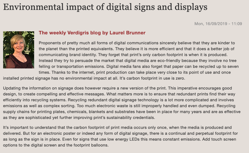 “Instead they try to persuade the market that digital media are eco-friendly because they involve no tree felling or transportation emissions. Digital media fans also forget that paper can be recycled up to seven times. Thanks to the internet, print production can take place very close to its point of use and once installed printed signage has no environmental impact at all. Its carbon footprint in use is zero.“