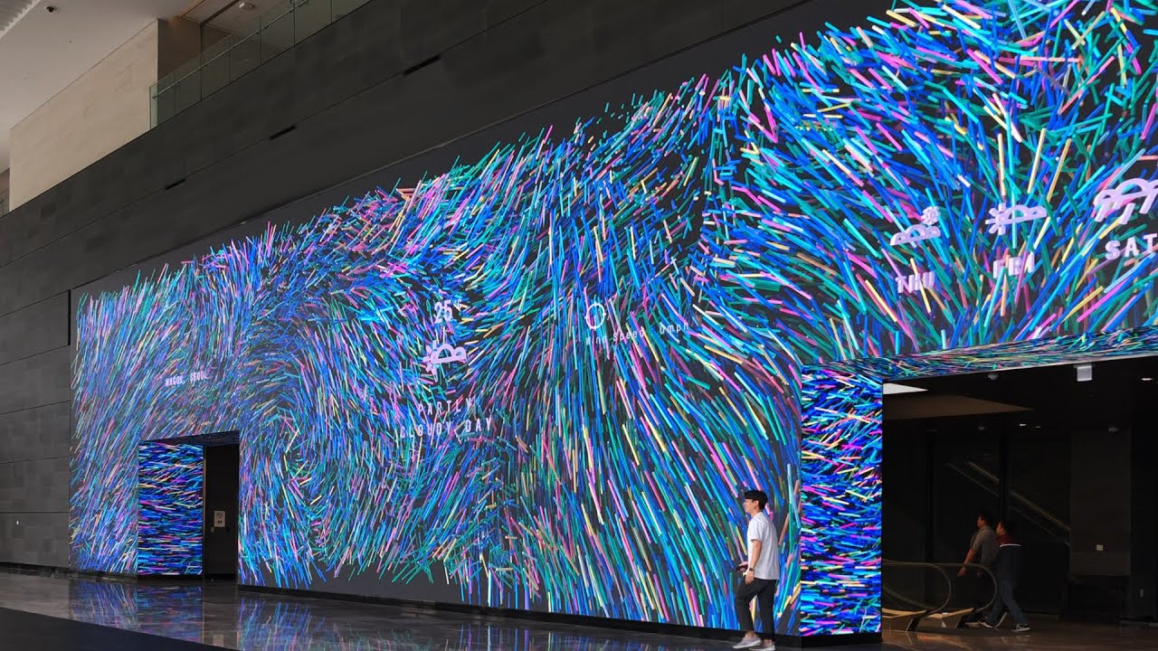 The lobby of the building has a 30 meter (98.5 feet) wide by 7 meter (23 feet) tall fine pitch LED media wall running a diverse range of custom creative developed by the agency d’strict.