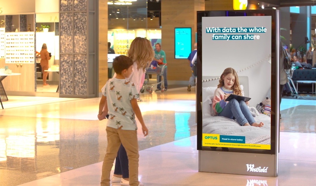 A digital out of home campaign on a digital poster network in Westfield-owned shopping malls, for the wireless carrier Optus, tailored Samsung Galaxy S10 smartphone ads to one of a small subset of viewing audiences.
