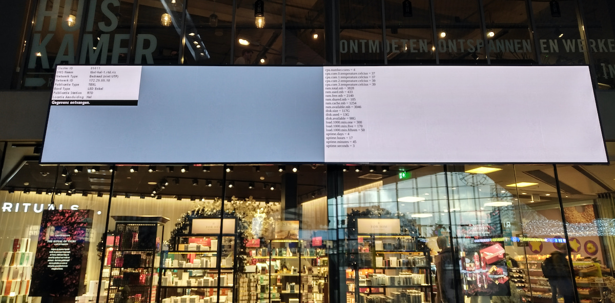 The big screen (photo provided by a reader) should be showing Dutch train schedules. It is instead showing diagnostics, including the IP address on the station’s network for the media player.