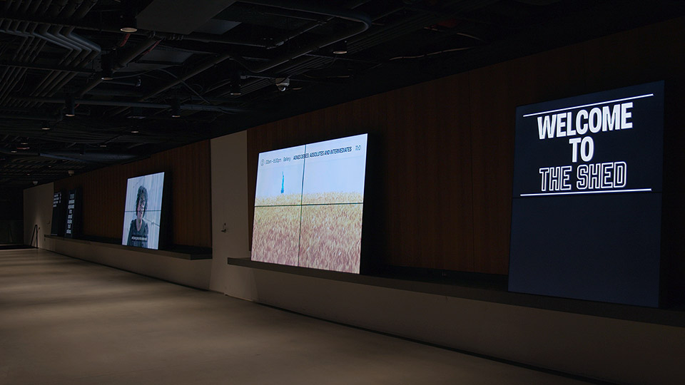 “Custom signage software combines realtime and near-time graphics, and is fully integrated with the Shed’s website content management system. Intelligent scheduling and rendering algorithms allow the network of displays to deliver location and schedule-aware content throughout the building, automatically.”