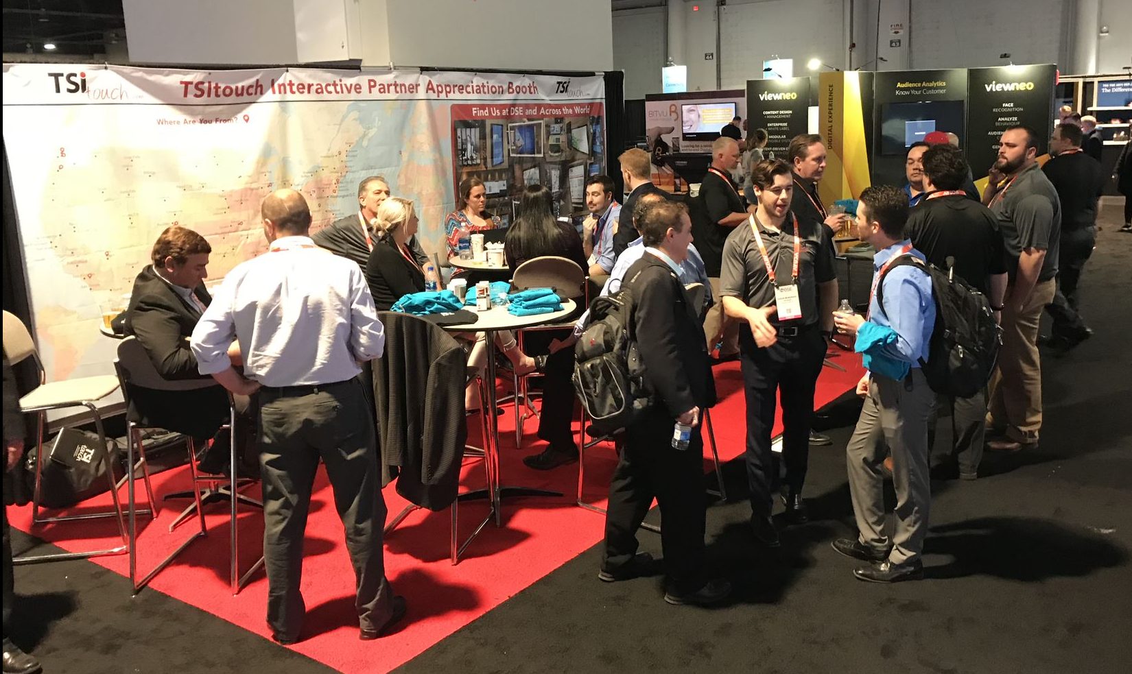 We do not show product inside of our booth at DSE. However, we do show great hospitality with a free coffee or water in the morning and a more refreshing beverage in the afternoon. The TSItouch booth is known to many as the relaxing getaway booth. We offer a place to sit down, chat, catch up with friends and partners as well as providing the opportunity to create new ones.