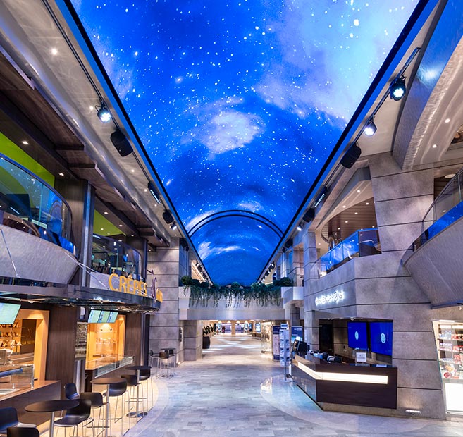 The entire ceiling of the 96 meter shopping promenade on the new MSC Bellissima is covered by a giant 480 sq. meter curved LED screen. It functions as a digital ceiling that creates an artificial atrium, but also runs a series of animations, including ports of call.