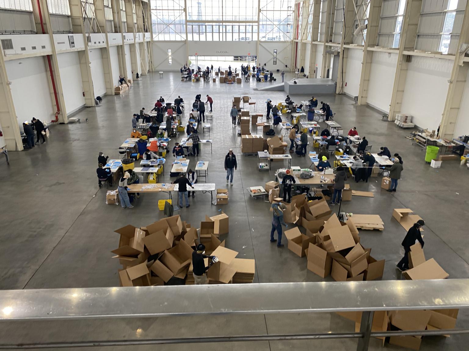 With the fabrication studio Bednark, Duggal staff have a goal of producing 360,000 face shields, and the big greenhouse building in the Navy Yards is filled with people, boxes and completed shields. Awesome!