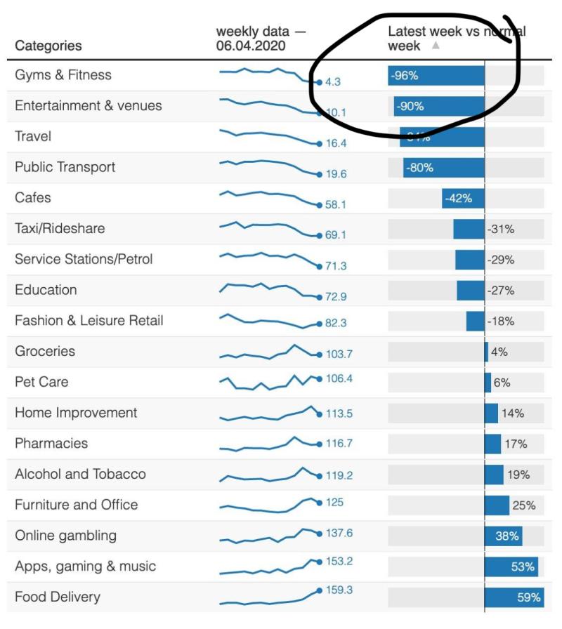 The research, involving some 250,000 residents Down Under, suggests fitness and entertainment venues have taken the biggest hit in this pandemic. It also provides big indicators of what else people are either not doing, or doing far less.