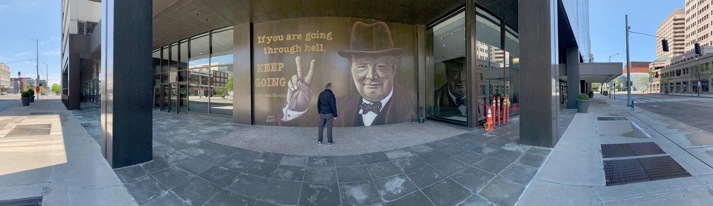 CEO Chris Riegel chose the image for his building, in response to the coronavirus pandemic, reports Dayton.com: “Churchill has always been an inspirational figure as one who faced incredible difficulty, yet pulled the nation together,” he said. “I think it is kind of an apropos moment, as it were.”