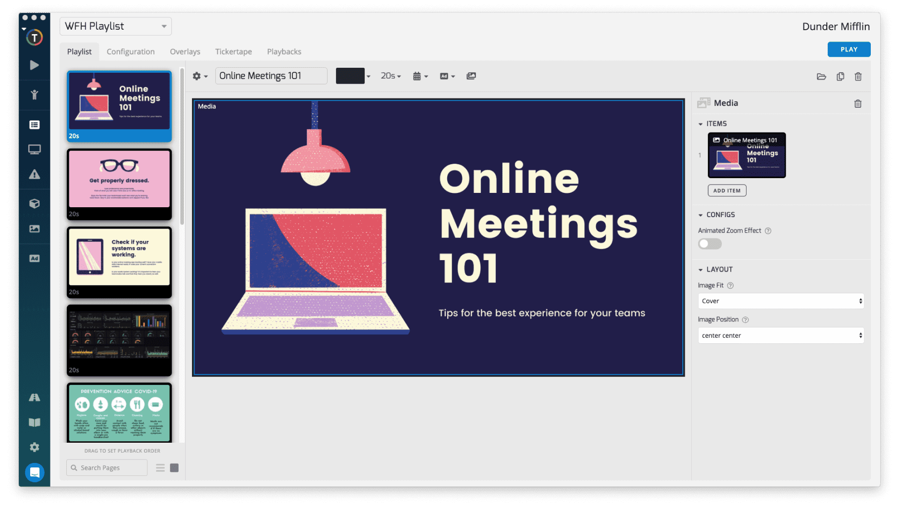 The software is a simple application that can be installed on a Windows or Mac computer, and then a playlist is set by an administrator based on the team the user is on.