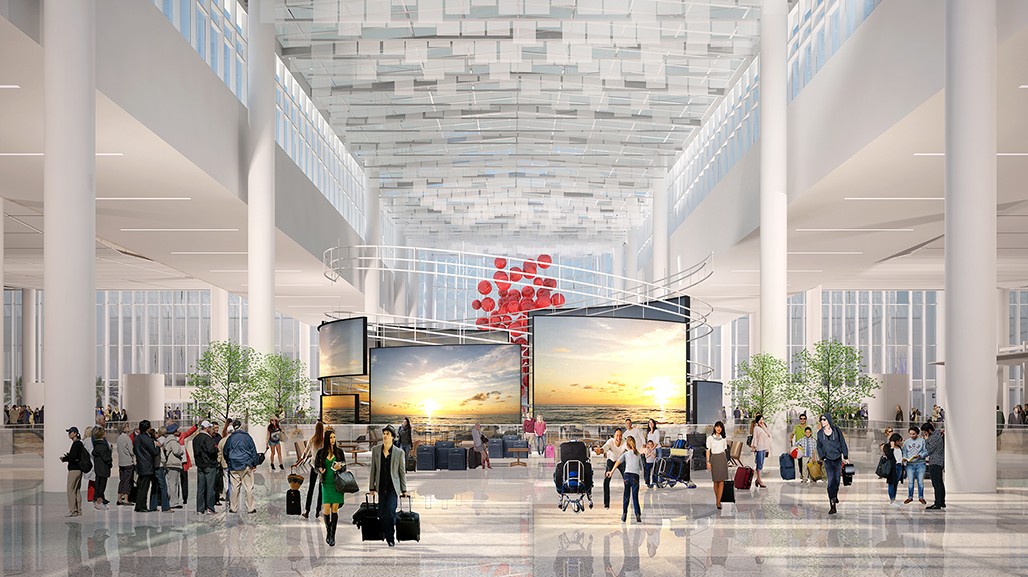 The new terminal will house a trio of digital displays, either floor-to-ceiling or several stories high: the “Windows on Orlando,” an “expansive panoramic reveal;” the “Moment Vault,” which will be “composed of three morphing garden-like walls;” and the “Portal,” a “3D suspended helix with both exterior and interior displays.”