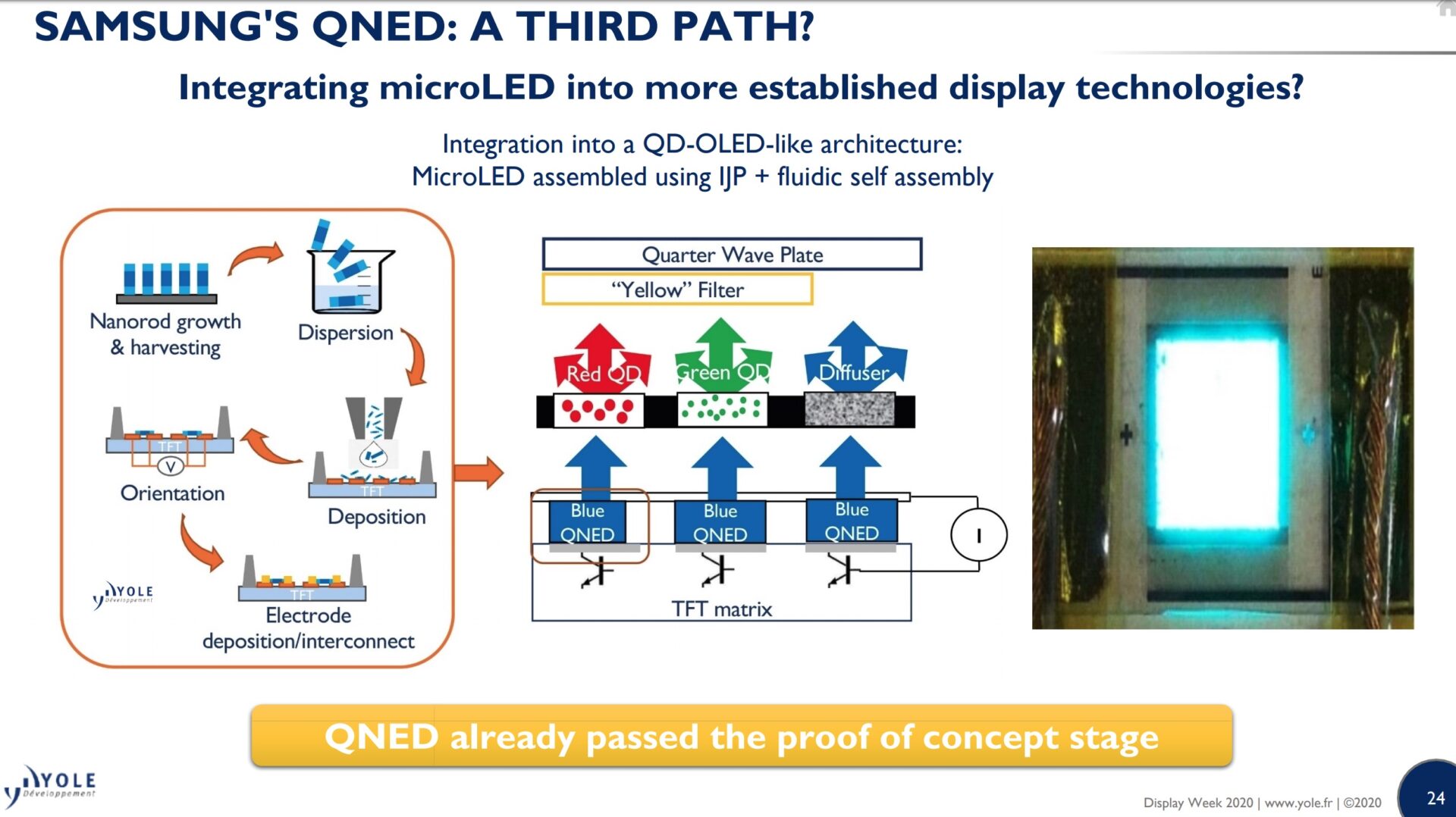 Eric Virey, a market analyst who closely follows the LED display market, said in his DisplayWeek 2020 talk that Samsung was well beyond the proof of concept stage with QNED and promising, but also that it was “not yet ready for prime time.”