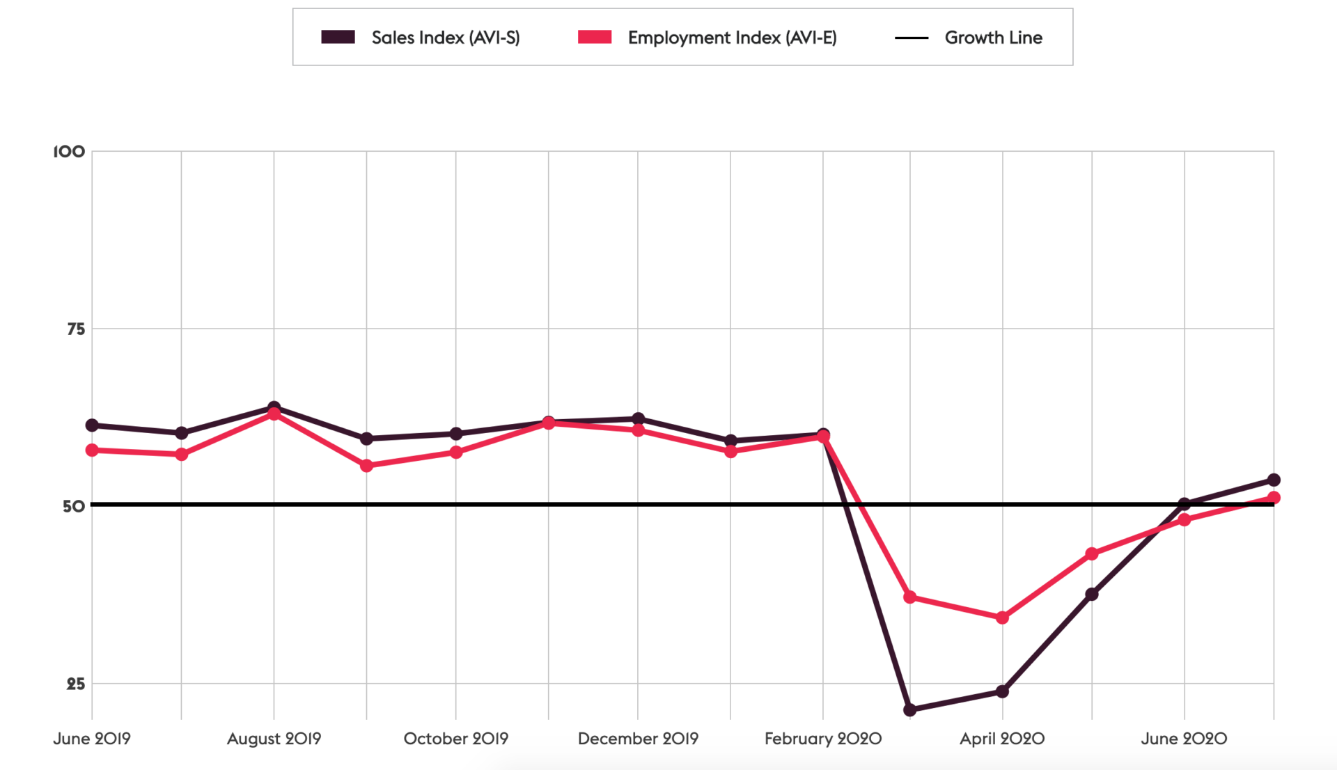 The index is calculated from a monthly survey that tracks trends. Two diffusion indexes are created using the data, the AV Sales Index (AVI-S) and AV Employment Index (AVI-E). The diffusion indexes are calculated based on the positive response frequency from those who indicated their business had 5 percent or more increase in billings/sales from the prior month plus half of the neutral response. An index of 50 indicates firms saw no increase or decline in the business activity; an index of more than 50 indicates an increase, while an index less than 50 indicates a decline.
