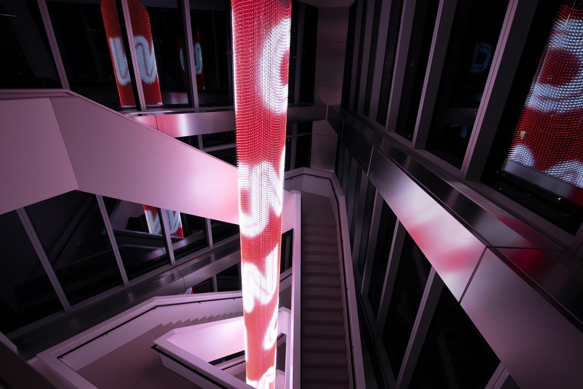 The Prow (dictionary definitions tend to call a prow the front of a boat, so not sure about the name’s origins) is described as a “data-driven light sculpture that rises 65 feet through four floors of the building’s iconic wrap-around staircase, and includes an immersive audio component.”