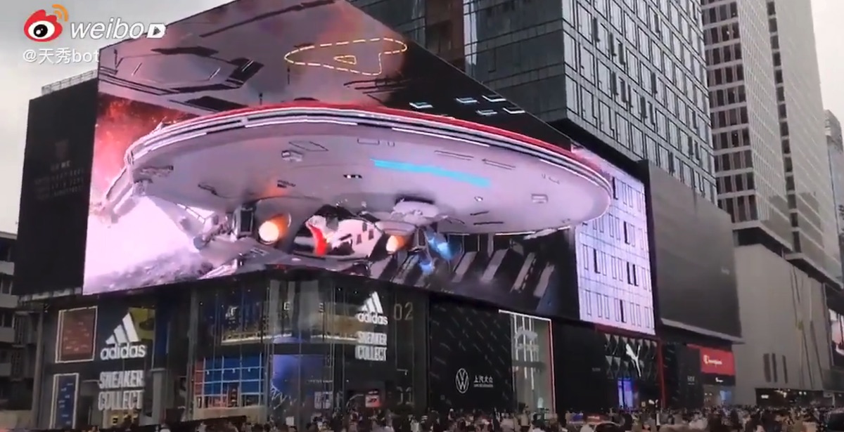 This is a big wrap-around DV LED display on the corner of an urban shopping plaza in Chengdu, China, using 3D animation techniques to create the illusion that a Star Trek ship is emerging from the building.