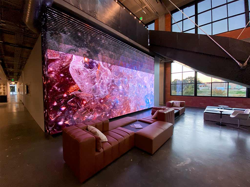 The display provides the Austin team with an ability to set the office vibe, but also work as a valuable tool. The LED display in the new offices features a combination of portfolio work, culture-related content, ambient nature content and locally-sourced creative content from Austin artists and students.